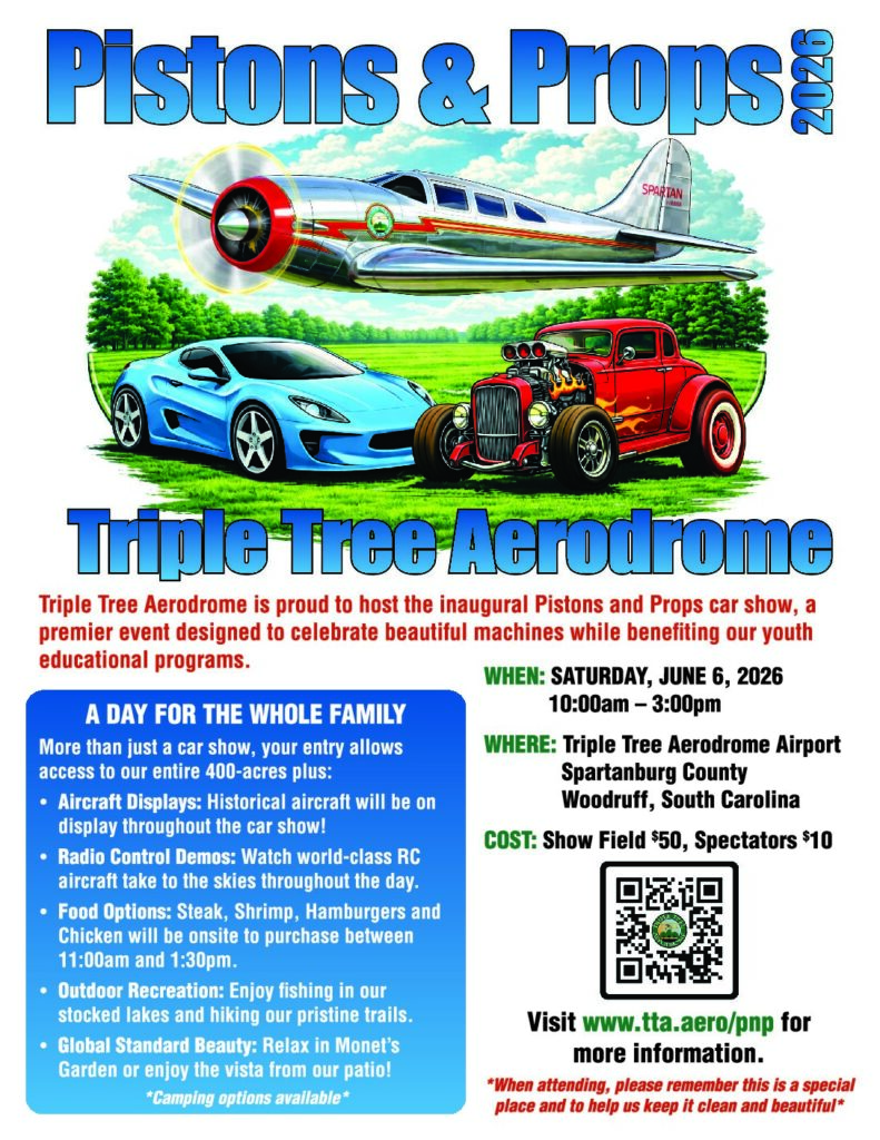 Pistons and Props – Triple Tree Aerodome June 6, 2026 at Triple Tree Aerodrome Spartanburg County, Woodruff SC