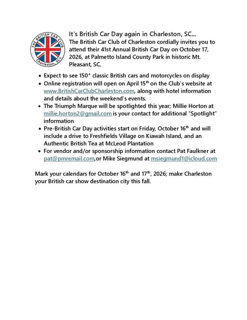 Saturday October 17, 2026 The British Car Club of Charleston Present the 41st Annual British Car Day at Palmetto Island County Park in historic Mt. Pleasant, SC. www.BritishCarClubCharleston.com