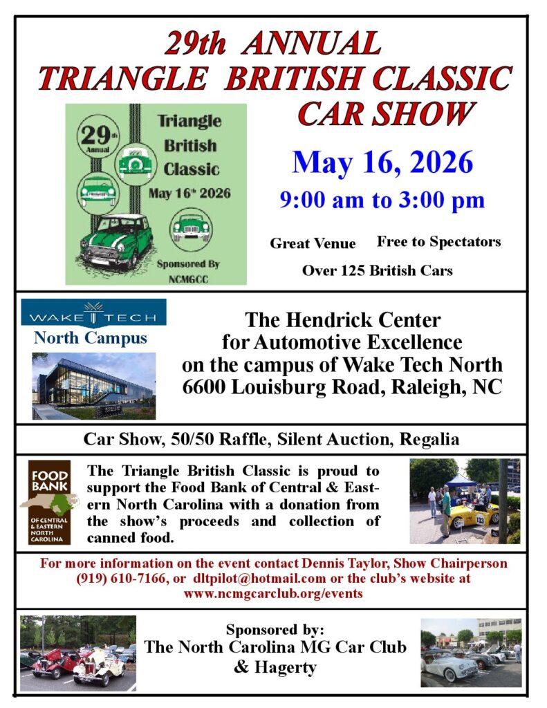 Saturday May 16, 2026 9:00 am to 3:00 pm. The 29th Triangle British Classic at The Hendrick Center for Automotive Excellence on the campus of Wake Tech North 6600 Louisburg Road, Raleigh, NC
